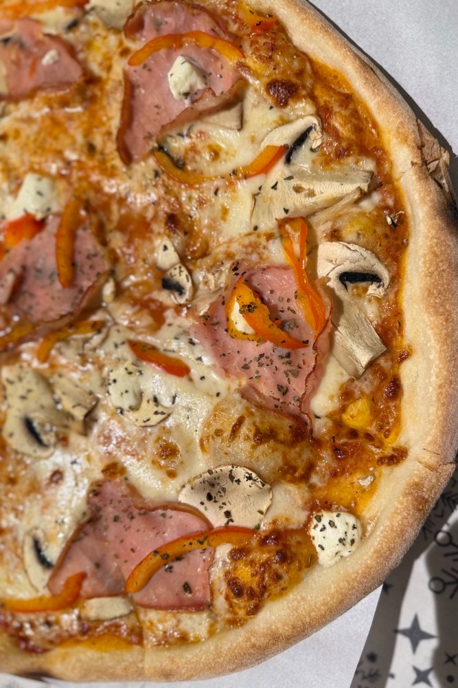 томатний соус, моцарела, бекон, шинка, печериці, синя цибуля, корнішони, часникова олія